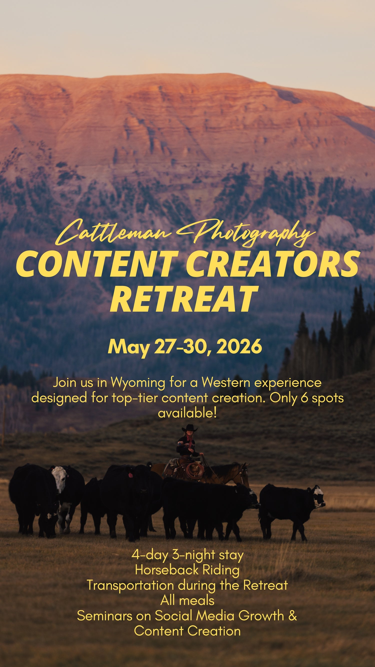 Join us as we explore the world of Western and Livestock Photography in some of the most beautiful places in the United States! Each Workshop is meant to help build your portfolio and grow your abilities as a photographer. There is hands-on education from Brock Barber, the man behind the camera of Cattleman Photography, and lots of opportunities to ask questions and get personalized advice. Cattleman Workshops are jampacked with incredible things you won't want to miss out on!